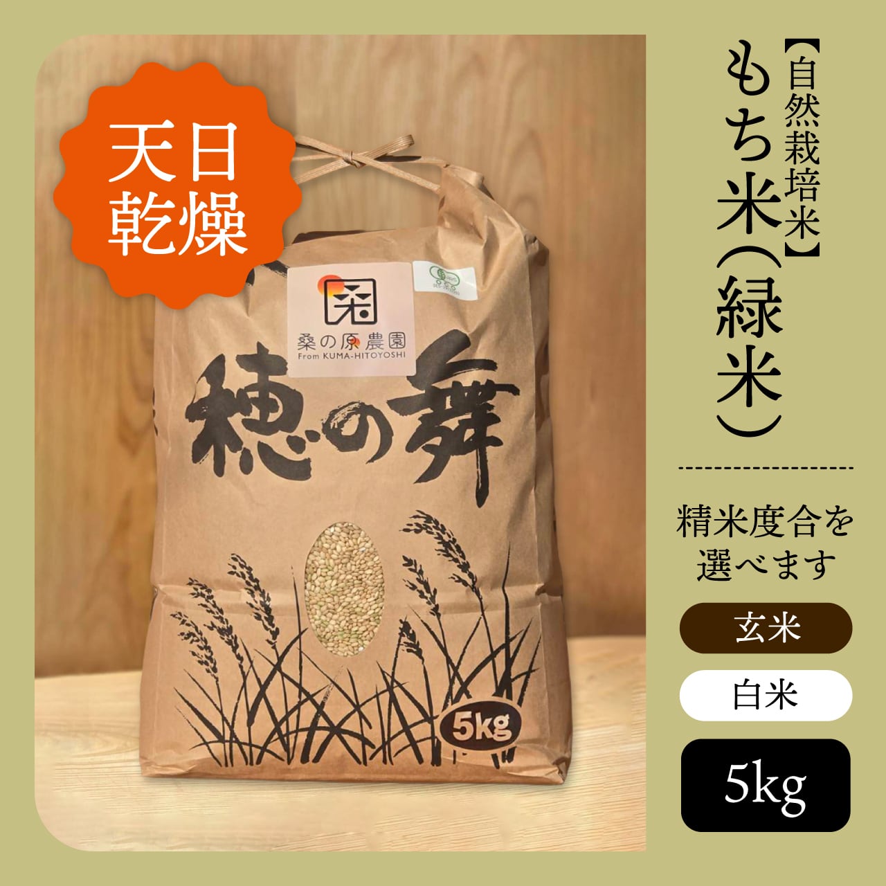 「日本で最も豊かな隠れ里」といわれる熊本県球磨郡で無農薬・無肥料の自然栽培で育てられた桑の原農園の緑米(もち米)。